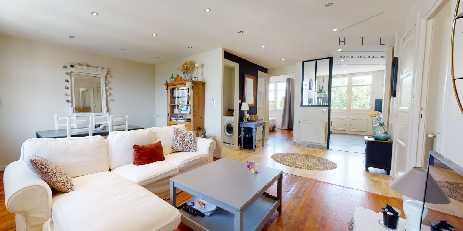 L'appartement traversant de 67 m2 carrez bénéficie d'un grand séjour, d'une cuisine ouverte équipée, de deux chambres dont une avec grand placard, une salle d'eau et d'un WC séparé.
